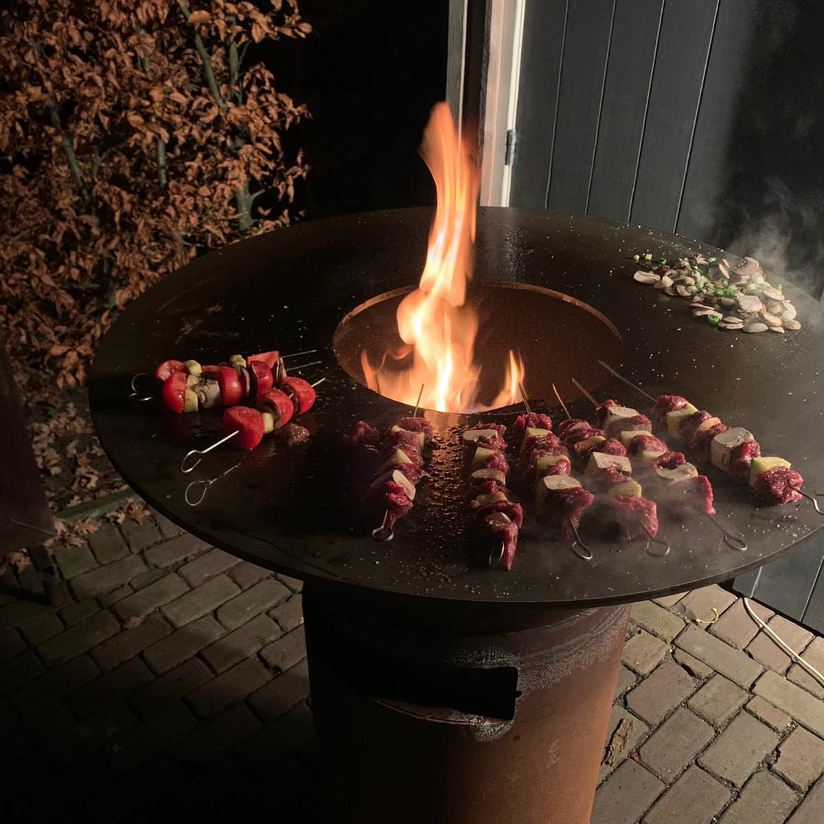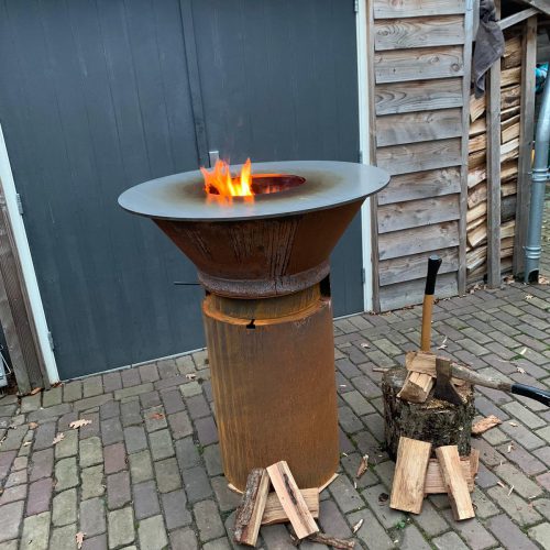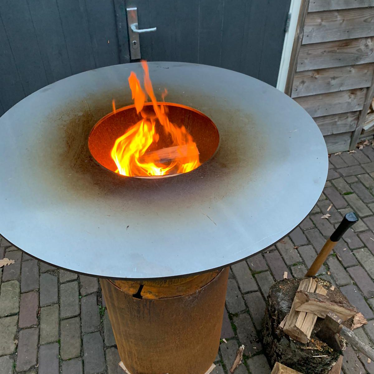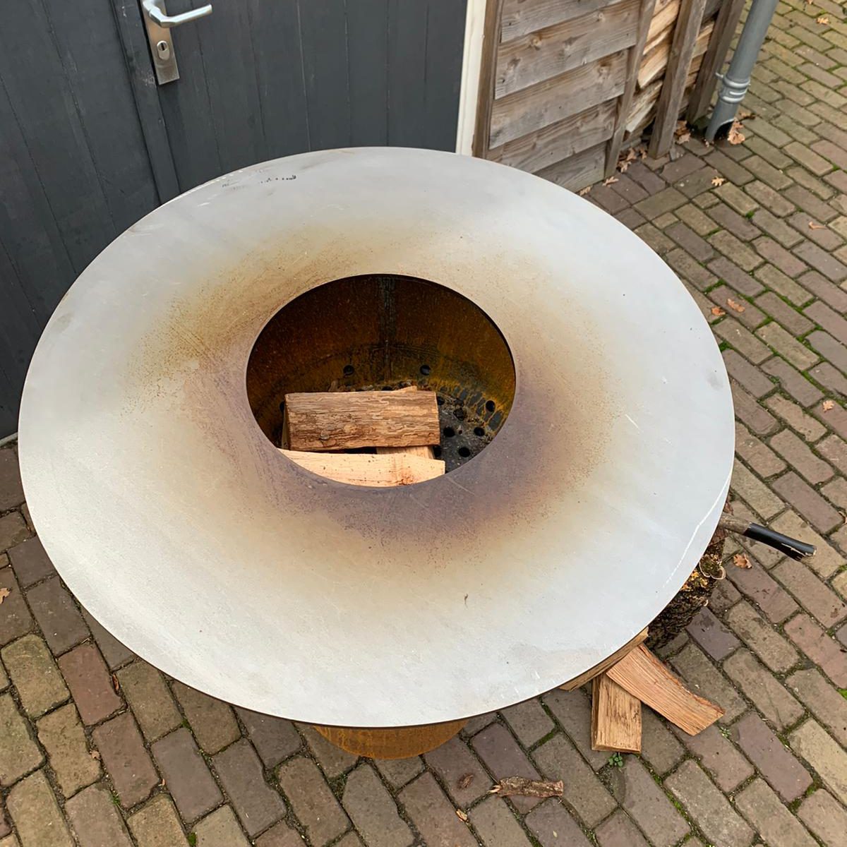Deze handgemaakte bakplaat/bbq is gemaakt van cortenstaal. Door de uitneembare as la is deze eenvoudig schoon te maken en is de zuurstoftoevoer regelbaar.